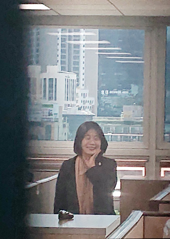 더불어민주당 윤미향 의원이 1일 서울 여의도 국회 의원회관 내 사무실에서 보좌진들과 웃으며 대화하고 있다.