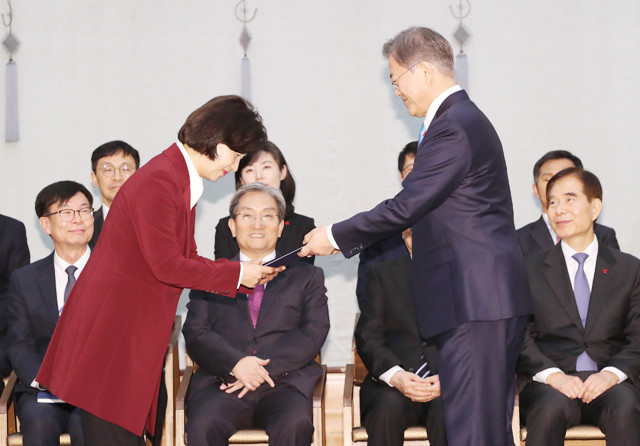 대통령이 2 오후 청와대에서 추미애 법무부 장관에게 임명장을 수여하고 있다.