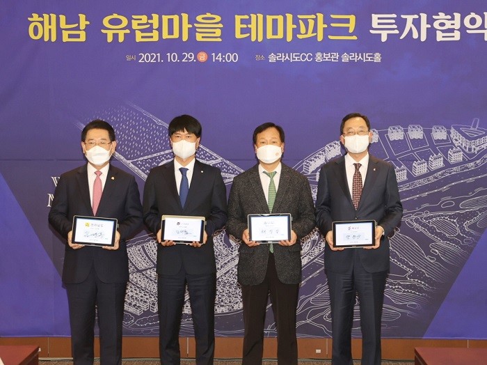 29일 솔라시도CC 홍보관에서 열린 투자협약식에는 김영록 전라남도지사와 명현관 해남군수, 김태형 ㈜더츠굿 대표이사, 채정섭 서남해안기업도시개발㈜ 대표이사가 참석해 국내 최고의 유럽형 관광도시 조성에 상호 협력해 나가기로 했다.