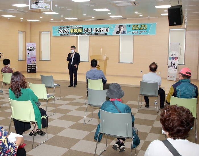 인천 중구는 지난 23일 연안동행정복지센터에서 ‘주민과 소통 유쾌한 날’을 개최했다. 이 행사는 장기화된 사회적 거리두기로 지친 구민을 위해 개최를 결정했으며 유튜브 중구TV로 실시간 방송했다. 사진은 이날 행사 1부 ‘2020 통!통!통! 중구 주민 아카데미’에서 홍인성 구청장이 인사말을 하고 있는 모습. (사진제공=중구청)