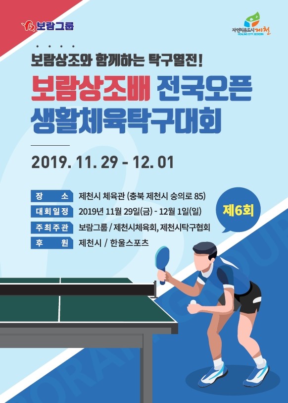 보람그룹과 제천시체육회·제천시탁구협회가 주최 및 주관하고 제천시와 한울스포츠가 후원하는 이번 탁구대회는 ▲남녀 개인 단식 ▲남녀 개인 복식 ▲단체전으로 일반부와 라지볼 경기로 나뉘어 진행된다. 대회 첫날인 29일에는 라지볼 경기가 30일과 12월 1일에는 일반부 경기가 펼쳐질 예정이다.