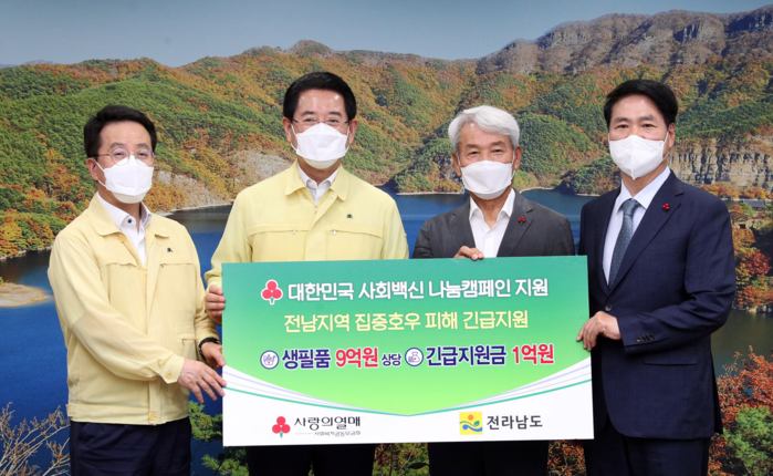 [남악=황승순 기자] 전라남도는 지난 16일 중앙사회복지공동모금회로부터 집중호우 피해 긴급지원금 1억 원과 9억 원 상당의 구호물품을 전달받았다.