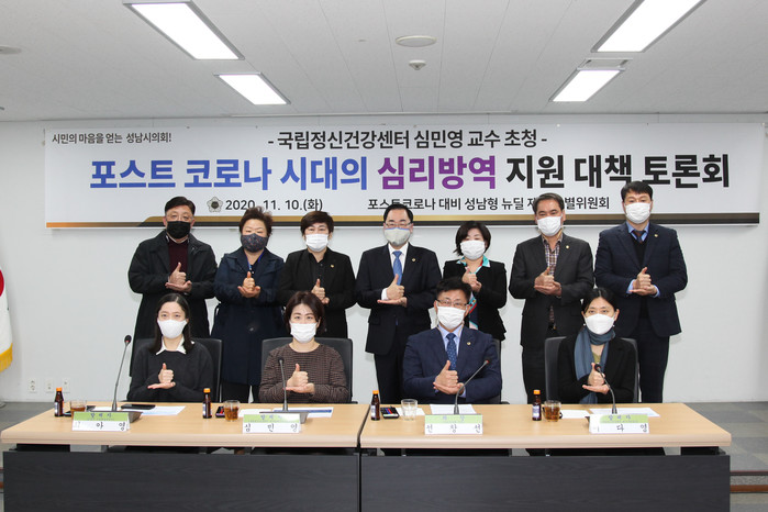 [성남=오왕석 기자] 성남시의회는 ‘포스트코로나 대비 성남형 뉴딜 제안 특별위원회(위원장 선창선)’ 주관으로 11월 10일 성남시의회 4층 세미나실에서 “포스트코로나 시대의 심리방역 지원 대책”이라는 주제로 시의원, 공무원, 관련 기관의 전문가 등이 참석한 가운데 토론회를 열었다.