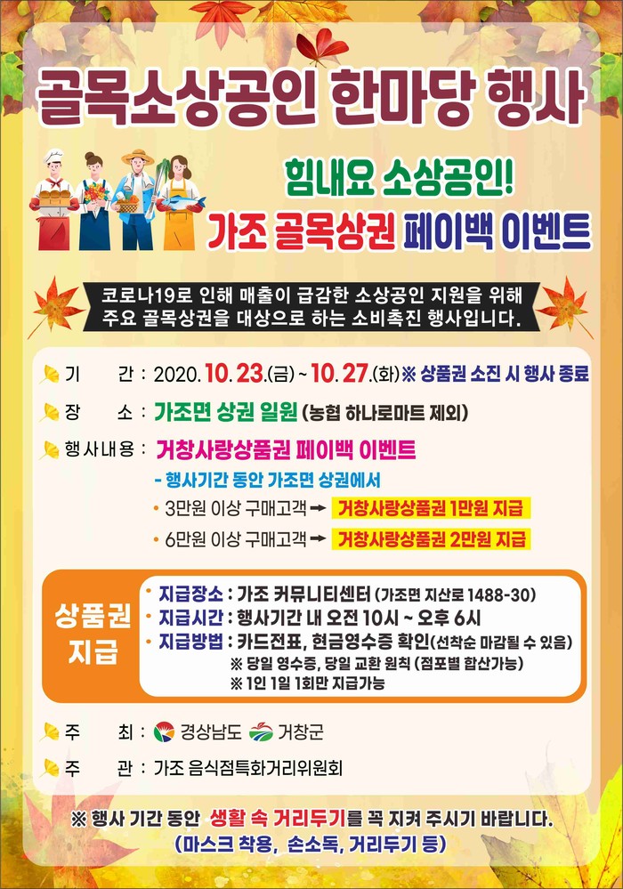 주요 행사는 행사기간 중에 가조면 일원 상권에서 상품 구매 시 거창사랑상품권을 돌려주는 페이백 이벤트로, 3만 원 이상 구매 고객은 1만 원, 6만 원 이상 구매 고객은 2만 원의 상품권을 돌려받을 수 있다.