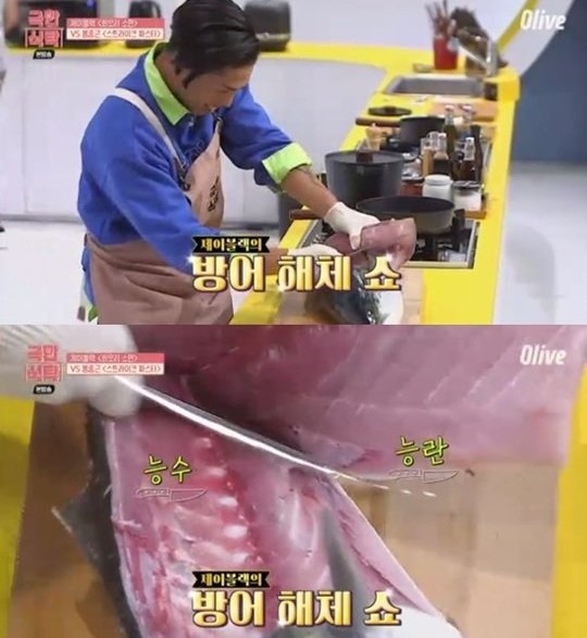 제이블랙은 요리대결 시작부터 치트박스를 공개했고, 박스 안에서는 커다란 방어가 나와 모두를 놀라게 했다. 아내 마리는 방어에 환호하다가 이내 익숙한 듯 침착한 반응. 황광희가 “남편이 회 뜨는 모습이 익숙한가 보다”고 묻자 마리는 “몇 번 봤다”고 말했다. 제이블랙은 “방어는 계절마다 맛이 다르다. 가을겨울에 기름이 올라오면 참치맛이 난다”고 설명했다.