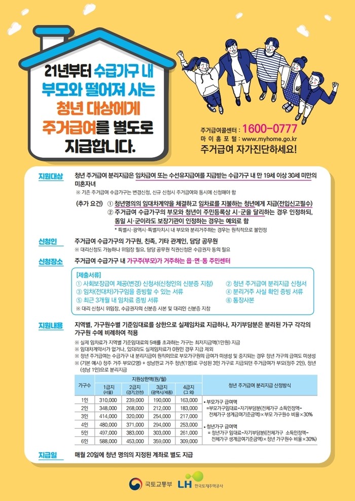 ‘청년 주거급여 분리지급’은 저소득층 청년이 취학과 구직 등을 목적으로 부모와 거주지를 달리하는 경우 별도로 주거급여를 받아 주거비를 마련할 수 있도록 국토교통부가 개정 시행하는 제도다.