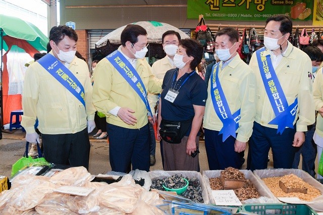 이날 말바우시장 방문은 김용집 광주시의회 의장, 문인 북구청장, 광주상공회의소, 광주경영자총협회, 광주경제진흥원, 광주신용보증재단 등 경제유관단체가 함께 참여해 침체된 전통시장 활성화에 힘을 보탰다.