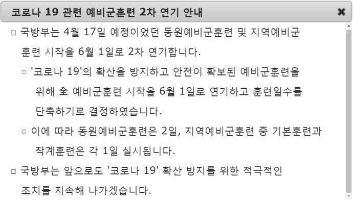 올해는 코로나19가 확산되면서 4월17일로 연기됐다. 이후에도 코로나19 확산세가 멈추지 않아 훈련 개시일이 다시 6월1일로 늦췄다. 이후 군당국은 전반기 예비군훈련을 아예 포기하고 9월까지 예비군 훈련을 하지 않기로 했다. 특별재난지역으로 선포된 대구, 경북(청도, 경산, 봉화) 지역 예비군은 이미 올해 훈련을 면제 시켰다. 또 코로나19 의료지원에 참여한 예비군 군의관ㆍ공중보건의사ㆍ간호장교도 올해 훈련에서 제외시켰다.
