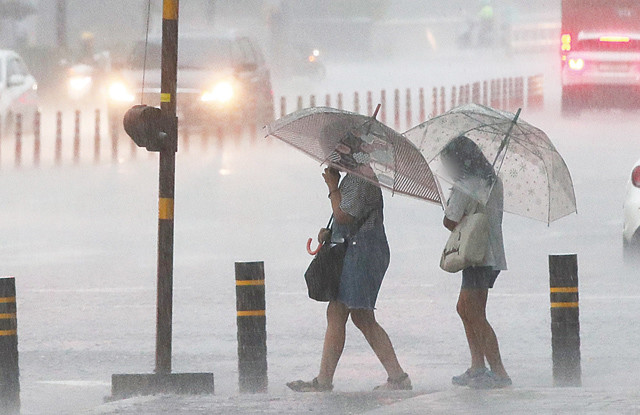 비가 내린 5 오후 경기도 성남시 분당구의 거리에서 어린이들이 우산을 쓰고 걷고 있다.