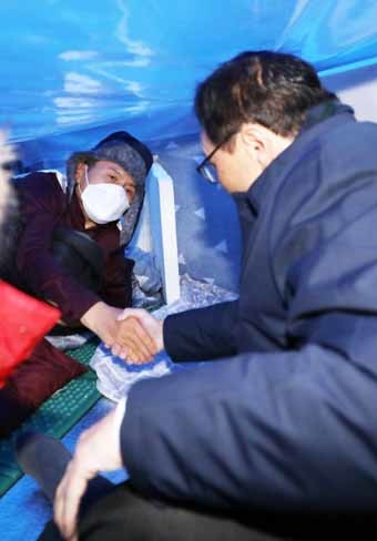 단식 중인 자유한국당 황교안 대표가 25 서울 종로구 청와대 분수대 단식 천막에서 더불어민주당 이해찬 대표를 만나 악수하고 있다.