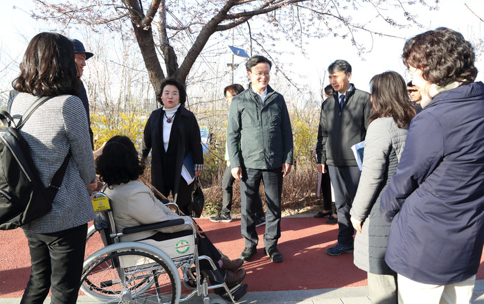 | ▲ 2019년 여의도 봄꽃 축제를 찾은 채현일 구청장(가운데)이 시민들과 이야기 하고 있다. (사진제공=영등포구청) |