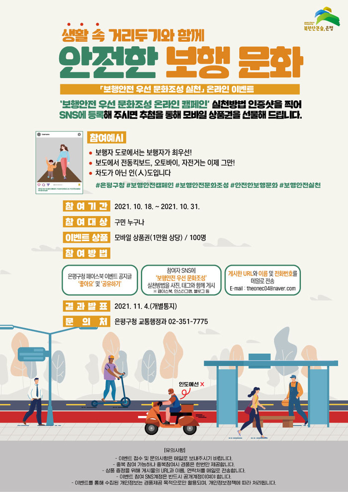 [시민일보 = 이대우 기자] 서울 은평구(구청장 김미경)은 ‘보행안전 우선 문화조성을 위한 온라인 캠페인’을 오는 18~31일 2주간 전개한다고 밝혔다.