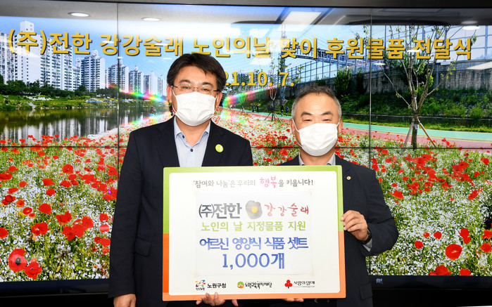 서울 노원구는 7일 (주)전한 강강술래로부터 노인의 날을 맞아 어려움을 겪는 지역내 홀몸노인들을 위한 식품세트(곰탕·볶음밥·냉면) 1000여개(1000만원 상당)를 기부받았다. 사진은 전달식에서 오승록 구청장(왼쪽)이 관계자와 기념촬영을 하는 모습. (사진제공=노원구청)