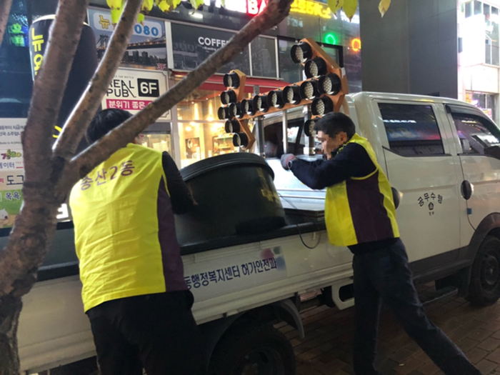 경기 의정부시 송산2동 행정복지센터는 최근 민락동 로데오거리, 금오동 홈플러스 상가 지역 일대를 대상으로 불법유동광고물(에어라이트, 입간판, 베너 등)에 대한 야간 특별단속을 실시했다. 사진은 불법유동광고물을 수거하고 있는 모습.(사진제공=의정부시청)
