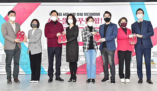 8일 서울 여의도 국민의힘 중앙당사에서 열린 서울시장 선거 본경선 미디어데이에서 기호추첨을 마친 오신환(왼쪽부터), 오세훈, 나경원, 조은희 후보가 빨간 운동화를 선물 받고 있다.