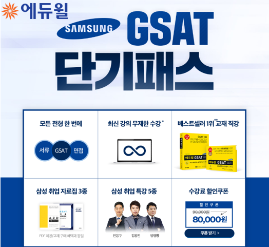 [시민일보 = 여영준 기자] 종합교육기업 에듀윌(대표 박명규)은 삼성 채용 전형을 한 번에 준비할 수 있도록 마련한 ‘GSAT 단기패스’ 과정을 선보인다고 19일 밝혔다.