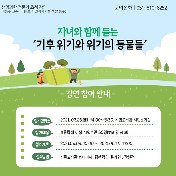 부산광역시립시민도서관(관장 김흥백)은 오는 6월 26일 오후 2시 도서관 강당 시민소리숲에서 지역주민을 대상으로 자녀와 함께 듣는‘기후 위기와 위기의 동물들’강연회를 연다.