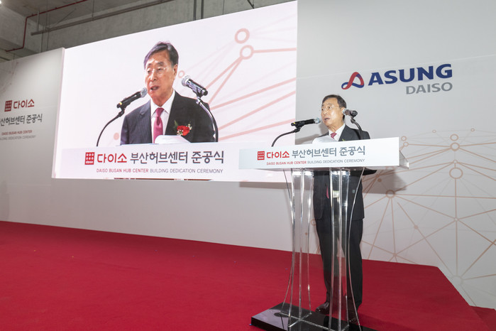 | ▲ 25일 오전, 부산 강서구 미음동 국제산업물류도시에 위치한 ㈜아성다이소 부산허브센터 오픈 행사에서 박정부 회장이 기념사를 전하고 있다. 그는 “최첨단 해외 수출입 전진기지인 부산허브센터를 구축함으로써 다이소의 또 다른 20년 미래 유통사업을 펼쳐나가겠다”는 포부를 밝히며 “부산 지역 경제 발전은 물론 일자리 창출, 수출입 증대, 협력업체와의 상생협력 등에 크게 이바지 할 수 있도록 노력하겠다”고 강조했다. |