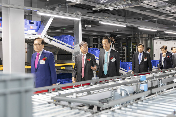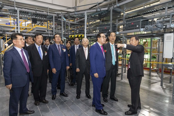 | ▲ 박정부 회장을 비롯한 참석자들이 센터의 최첨단 물류시스템을 탐방하고 있다. |
