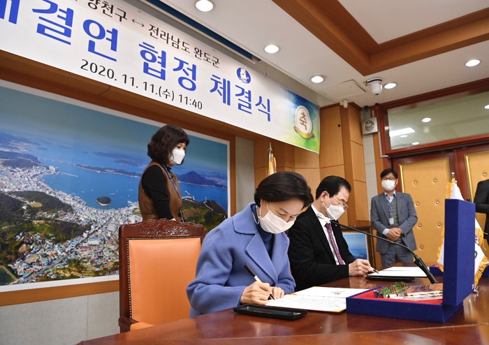 11일 오전 전남 완도군청 회의실에서 김수영 양천구청장과 신우철 완도군수가 양 지자체간 지역발전을 도모하고자 자매결연 협정을 맺고 있다.