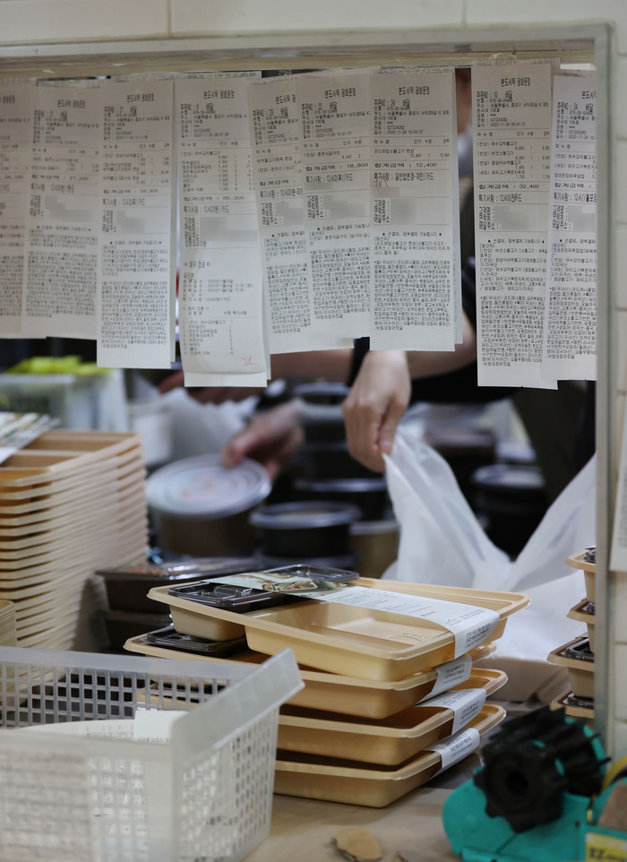 수도권 사회적 거리 두기가 2단계로 격상된 24일 오후 서울 시내의 한 도시락 전문점에 도시락 주문 영수증이 붙어있다.