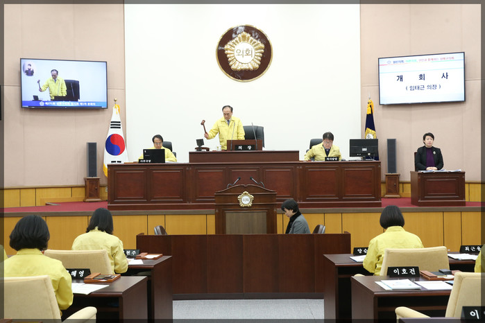 임 의장은 개회사를 통해 "우리 구에서는 신종 코로나바이러스로부터 주민을 보호하기 위한 재난안전대책본부를 24시간 운영하고, 모든 동에 방역을 실시하는 등 주민들의 안전을 위해 최선을 다하고 있으니, 주민들께서는 개인위생 관리에 철저히 신경 써 주시고 관계 기관이나 보건소의 안내에 적극 협조하여 줄 것"을 당부하고 어려운 상황이지만 의원들과 공무원들은 주민 복리 증진을 최우선의 가치로 두고 연(年) 초에 계획했던 일들을 차질 없이 진행할 것"이라고 밝혔다.