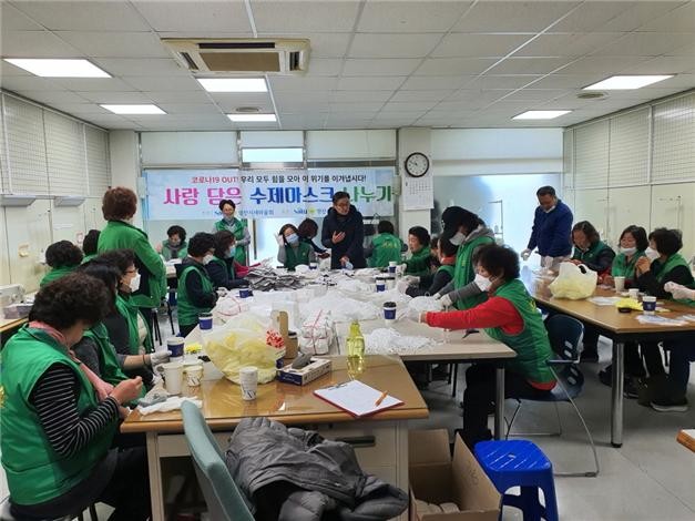 이에 새마을부녀회에서는 1일 30명씩 동참해 3,000개, 자원봉사센터에서는 1일 15명씩 참여로 1,000개를 여성복지센터 양재실을 이용하여 자체적으로 수제 천 마스크를 생산하고 있다. 마스크 원단을 자르는 것을 시작으로 박음질을 거쳐 최종 끈을 끼우고 포장까지 복잡한 공정을 거쳐 하나의 마스크가 완성되는 것으로 많은 시간과 정성이 요구되는 작업이다. 지난 13일부터 시작해 오는 19일까지 제작 예정으로 완료 후 신속하게 배부 하여 도움을 줄 예정이다.