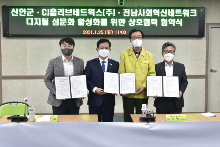 신안군청 보건소 대회의실에서 열린 이번 체결식에는 박우량 신안군수, CJ올리브네트웍스 차인혁 대표이사, 전남사회혁신네트워크 정순남 이사장을 비롯한 주요 관계자가 참석했다.