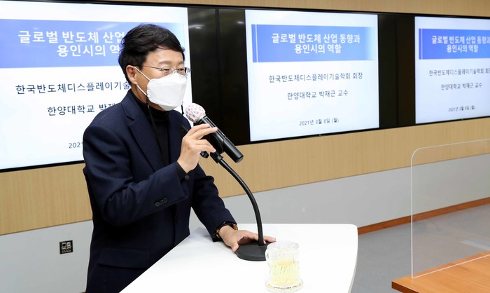 | ▲ 8일 용인시 직원 소통회의에서 반도체 분야 국내 최고 권위자이자 한국반도체디스플레이기술학회장을 맡고 있는 박재근 한양대학교 융합전자공학부 교수가 특강을 하고 있다 |