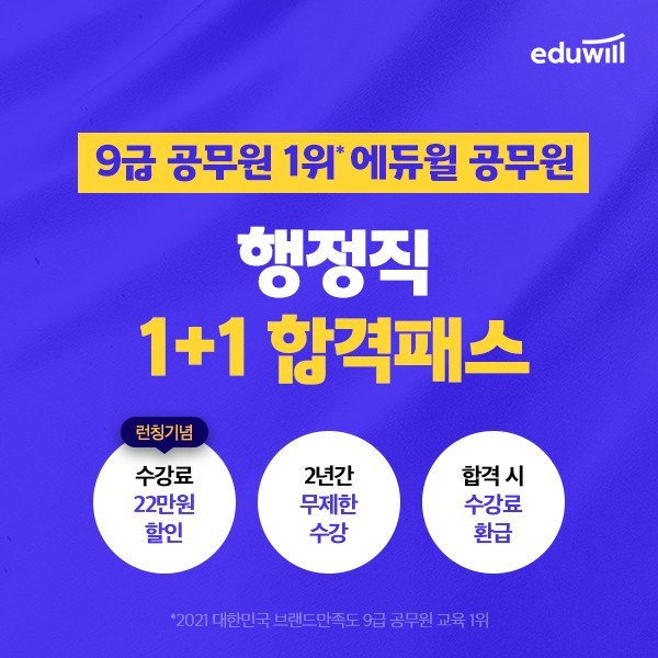 [시민일보 = 여영준 기자] 종합교육기업 에듀윌(대표 박명규) 공무원이 내년까지 강의를 무제한 지원하는 ‘행정직 1+1 합격패스’ 강좌를 운영한다고 밝혔다.