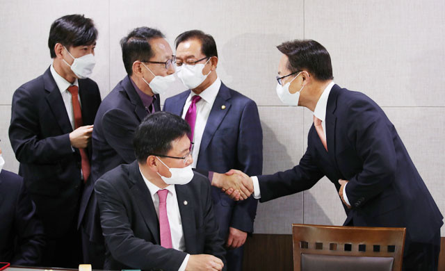 27일 오전 국회 의원회관 식당에서 열린 미래통합당 3선 당선자 모임 회의에서 김도읍 의원과 조해진 당선인이 인사하고 있다.   /연합뉴스