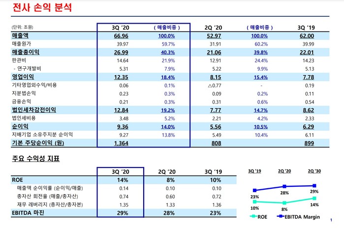 영업이익은 매출이 큰 폭으로 증가한 가운데, 적극적 비용 효율화 노력 등으로 전분기 대비 4조2000억원 증가한 12조3500억원을 기록했고, 영업이익률도 18.4%로 큰 폭으로 개선됐다.