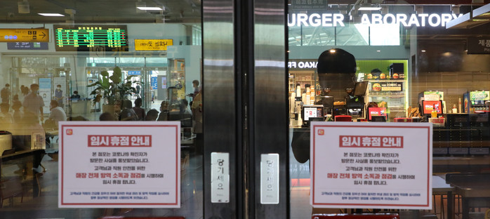 12일 오후 롯데리아 서울역점에 코로나19 확진자 관련 임시 휴점 안내문이 붙어 있다. 이날 서울시에 따르면 지난 6일 광진구에서 모임을 가진 롯데리아 시내 지점 점장 등을 포함한 직원 19명 중 9명이 확진 판정을 받았다.