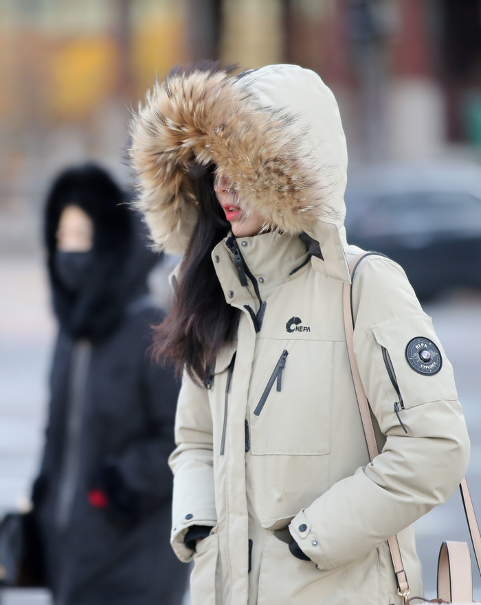 영하 9도까지 기온이 떨어진 2일 오전 서울 종로구 광화문네거리에서 두꺼운 외투를 입은 시민들이 발걸음을 옮기고 있다.