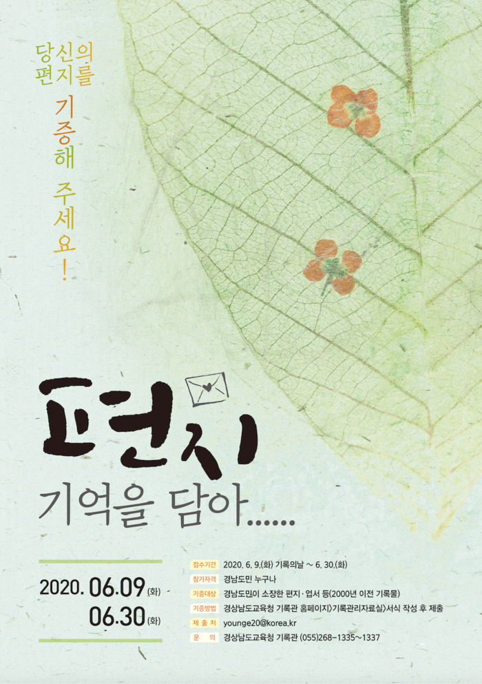 경상남도교육청(교육감 박종훈)은 6월 9일 기록의 날을 맞아 “편지, 기억을 담아”라는 주제로 기록물을 수집한다.