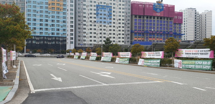 [남악=황승순 기자] 전남교육청 입구 도로변에 일부 교육단체에서 마구잡이로 설치한 수십장의 현수막이 공식 게시대가 아닌 나무에 자신들의 의견을 알리고자 설치해 지나는 운전자들의 눈살을 찌뿌리게 하고 있다.