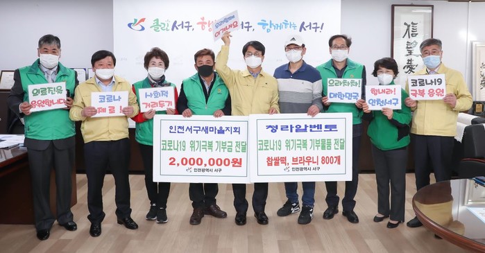 인천 서구가 최근 코로나19 확산으로 어려운 이웃을 위한 구 새마을지회의 성금 200만원과 청라 알벤토로부터 대구지역을 위한 찹쌀떡과 브라우니(간식류) 800개(30만원 상당)를 전달받았다. 사진은 이재현 구청장(가운데)과 관계자들의 기념촬영 모습. (사진제공=서구청)