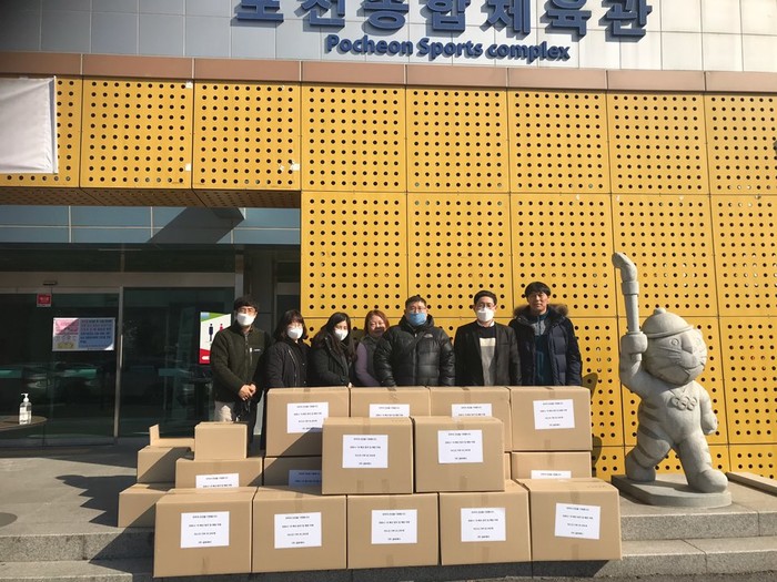 경기 포천시가 5일 신북면에 위치한 마스크 제조업체 (주)글로제닉으로부터 코로나19 예방을 위한 마스크 2만5000장(2800만원 상당)을 기탁받았다. 이날 전달받은 마스크는 노인·장애인 복지시설 등 지역내 153곳에 배부됐다. 사진은 관계자들의 기념촬영 모습. (사진제공=포천시청)