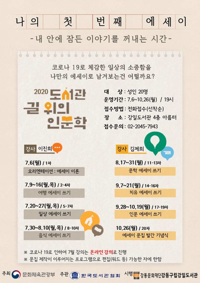 프로그램은 강일도서관 4층 아름터에서 매주 월요일 오후 7시부터 2시간 동안 총 20차시로 진행된다. 여행, 일상, 음식, 문학, 치유 등 5개 분야에 대해 강사와 함께 이야기를 쓰고, 읽는다. 마지막 시간에는 에세이 문집 발간 기념식을 통해 가까운 지인들과 소통의 장도 마련할 예정이다. 코로나19로 인해 7월 강의는 화상회의 플랫폼을 활용해 온라인 강의로 진행한다.