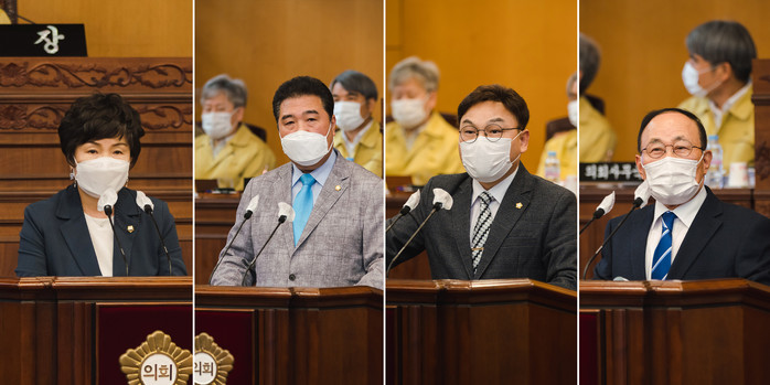 | ▲ (왼쪽부터)이명옥·장길천·이경호·추윤구 의원이 5분 발언을 하고 있다.(사진제공=광진구의회) |
