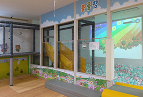 리모델링으로 새롭게 구성된 활동영역은 포토존, 암벽등반, 블록영역과 볼풀영역으로 이어지는 그물다리와 미끄럼틀, 그리고 볼풀장 안에는 공을 던지면 팡팡 터지는 터치스크린을 설치하여 아이들이 신나게 놀이할 수 있는 공간으로 변모했다.