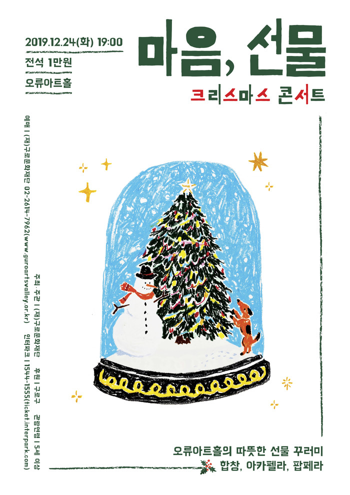 오류아트홀은 첫 번째 크리스마스콘서트 ‘마음,선물’로써 공연장의 문턱을 낮추기 위한 가족 대상 프로그램을 구성하였으며 오픈과 동시에 매진을 기록하고 있다. 그밖에 현장에서 엽서로 마음을 전할 수 있는 이벤트 등 지역 주민들에게 따뜻한 연말을 마무리 할 수 있는 시간을 선사할 것이다.