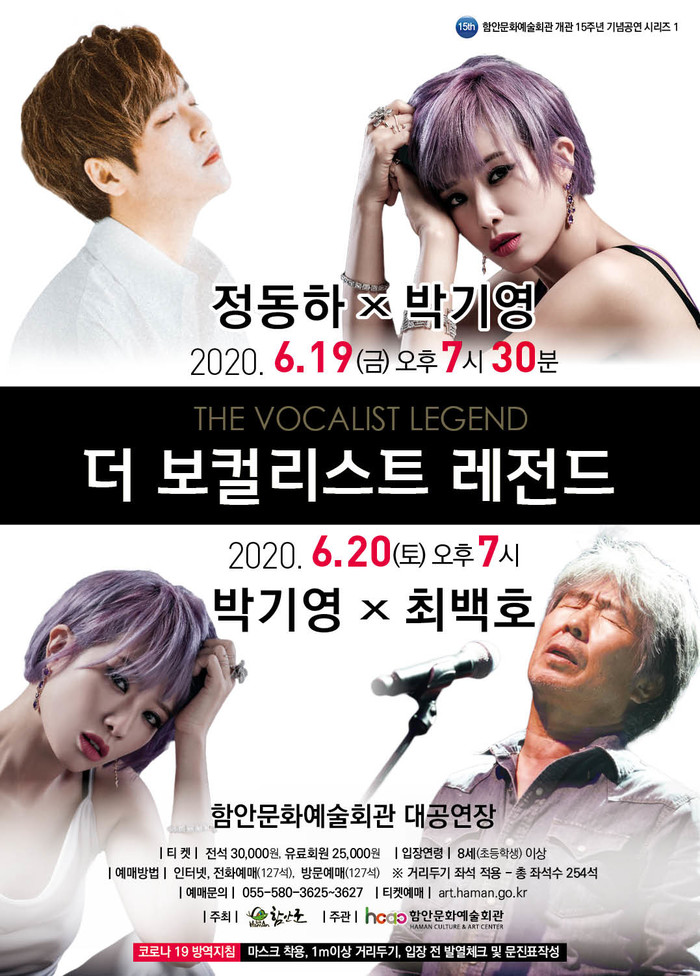 ‘더 보컬리스트 레전드’ 공연은 19일 오후 7시 30분에 정동하, 박기영을, 20일 오후 7시에는 최백호, 박기영을 만날 수 있다.