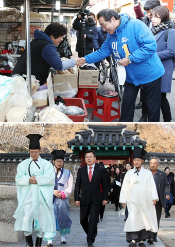 더불어민주당 후보로 종로 출마를 선언한 이낙연 전 국무총리가 10일 서울 종로구 창신동 거리에서 상인과 인사를 나누고 있다(위). 자유한국당 황교안 대표가 10일 서울 종로구 성균관 내 대성전을 둘러보고 있다. /연합뉴스