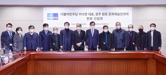 이용섭 광주광역시장과 이낙연 더불어민주당 대표(좌로부터 여덟 번째)가 11일 오전 동구 국립아시아문화전당 제2회의실에서 열린 원로 문화예술인 현장 간담회에 참석해 기념촬영을 하고 있다./광주광역시 제공