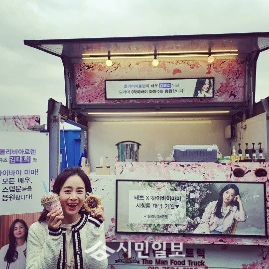 배우 김태희는 자신의 인스타그램을 통해 "오늘 드디어 하이바이마마 첫방이네요~아침부터 떨리고 설레고 긴장되는 맘...^^이따 저녁 7시에 카카오라이브채팅 에서 함께하고 9시부터는 다같이 본방사수해요 여러분~~올리비아로렌이 보내준 커피차도 정말 감사해요...!!"라는 글과 함께 사진을 게재했다.