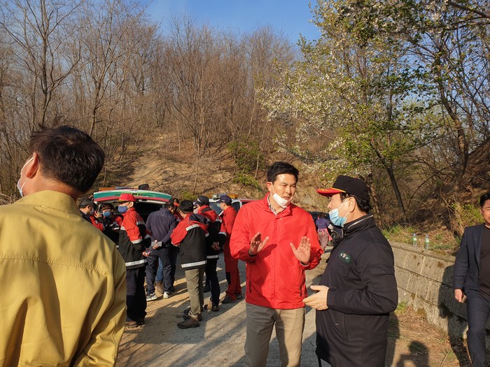 김태호 후보는 8일 함양군 병곡 도천에서 산불 발생소식을 접하자 모든 선거 운동 일정을 중단하고 산불현장에 가서 산불진화 요원들을 격려했습니다.