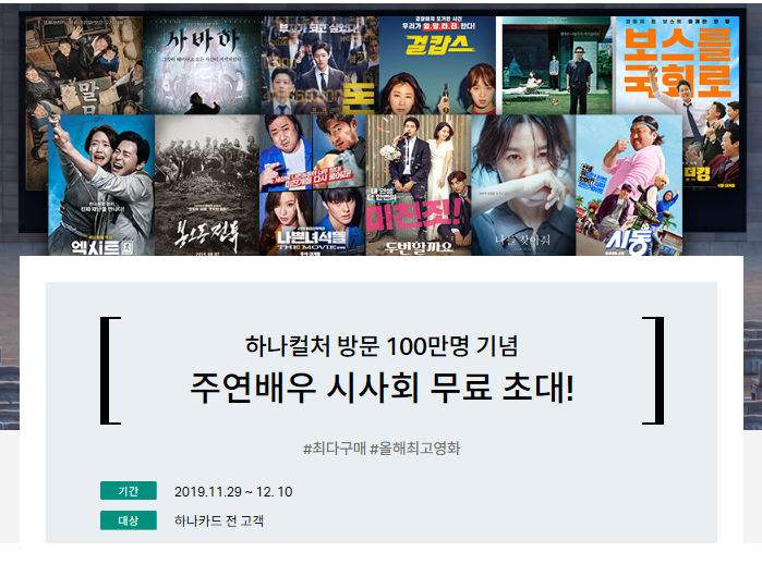 [시민일보 = 여영준 기자] 하나카드는 2019년 하나컬처 홈페이지 방문 고객 수 100만명 돌파를 기념하기 위해 올해 최고의 영화를 뽑는 ‘올해 최고의 영화는?’ 이벤트를 진행한다고 4일 밝혔다.