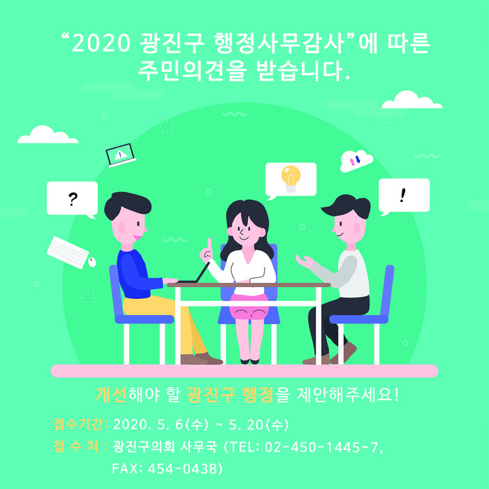 [시민일보 = 여영준 기자] 서울 광진구의회(의장 고양석)는 2020년도 행정사무감사(6월4일~6월12일)를 앞두고 오는 20일까지 구 행정 발전에 밑거름이 될 수 있는 주민의견을 받는다고 밝혔다.