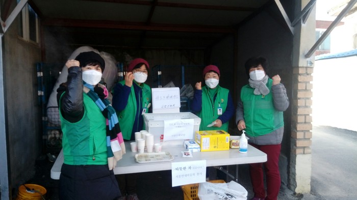 경기 양평군 서종면 새마을회는 최근 서종우체국 앞에 마스크 구매를 위해 줄을 선 주민들의 불편을 최소화하기 위해 방풍 천막과 의자를 설치해 앉아서 대기할 수 있도록 하고 추위를 녹일 수 있도록 차를 대접했다. 사진은 기념촬영을 하는 모습.(사진제공=양평군청)